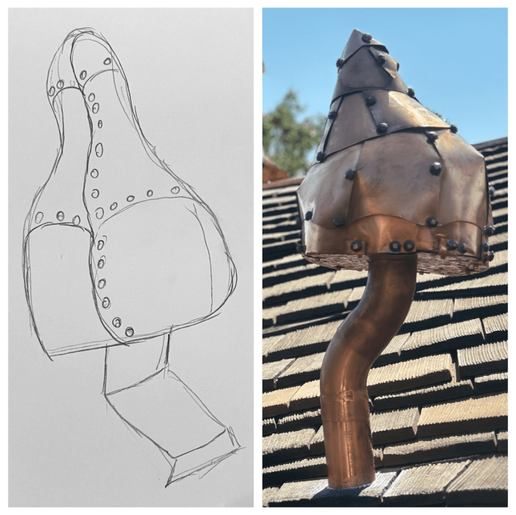 Custom artistry was embedded in the process. At one point, the homeowner handed Brian a sketch of a whimsical mushroom, asking, “Do you think you can make this?” He not only said yes, he carved the form from styrofoam himself and used it as a mold to shape a show-stopping copper accent.