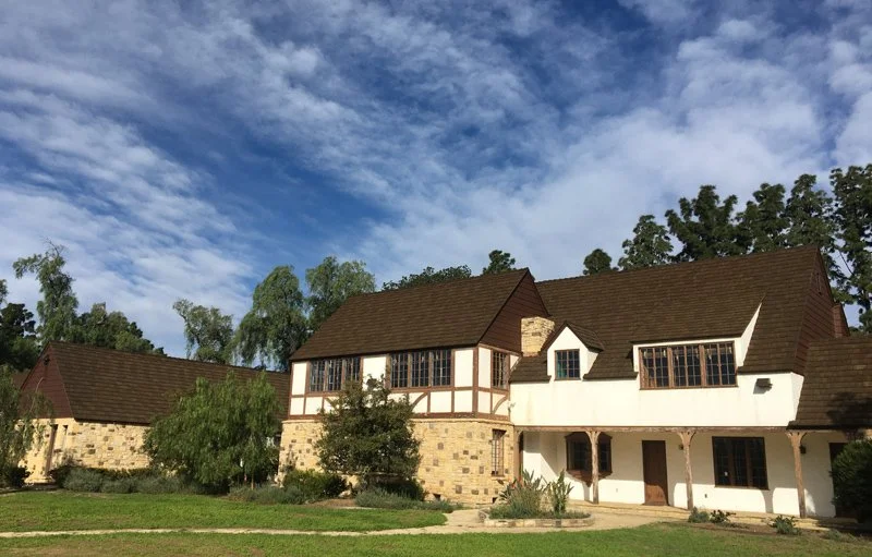 A white house with a dark roof.