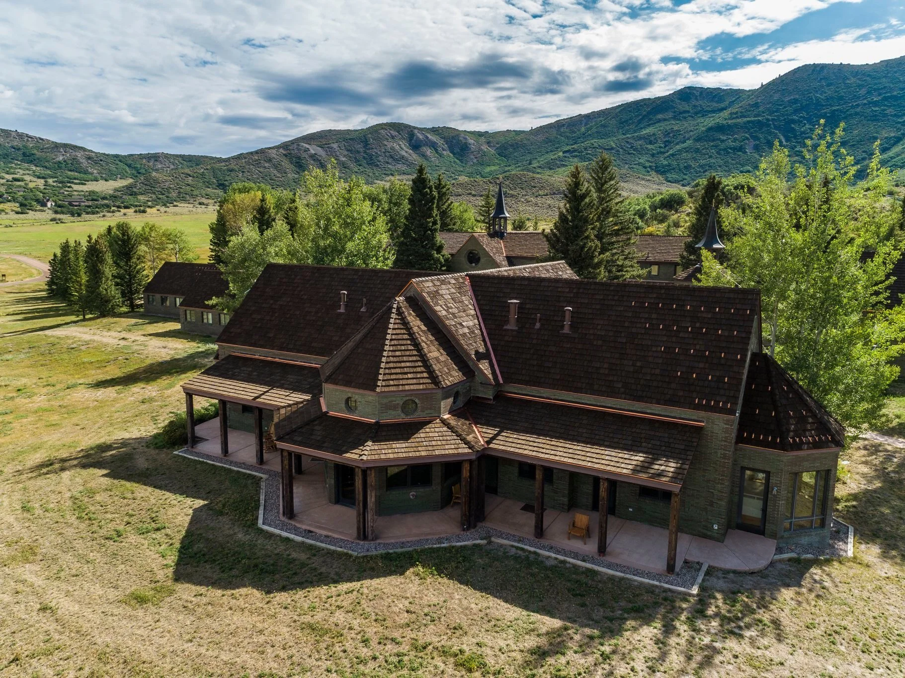 Combination metal and shake roofing features on a home.